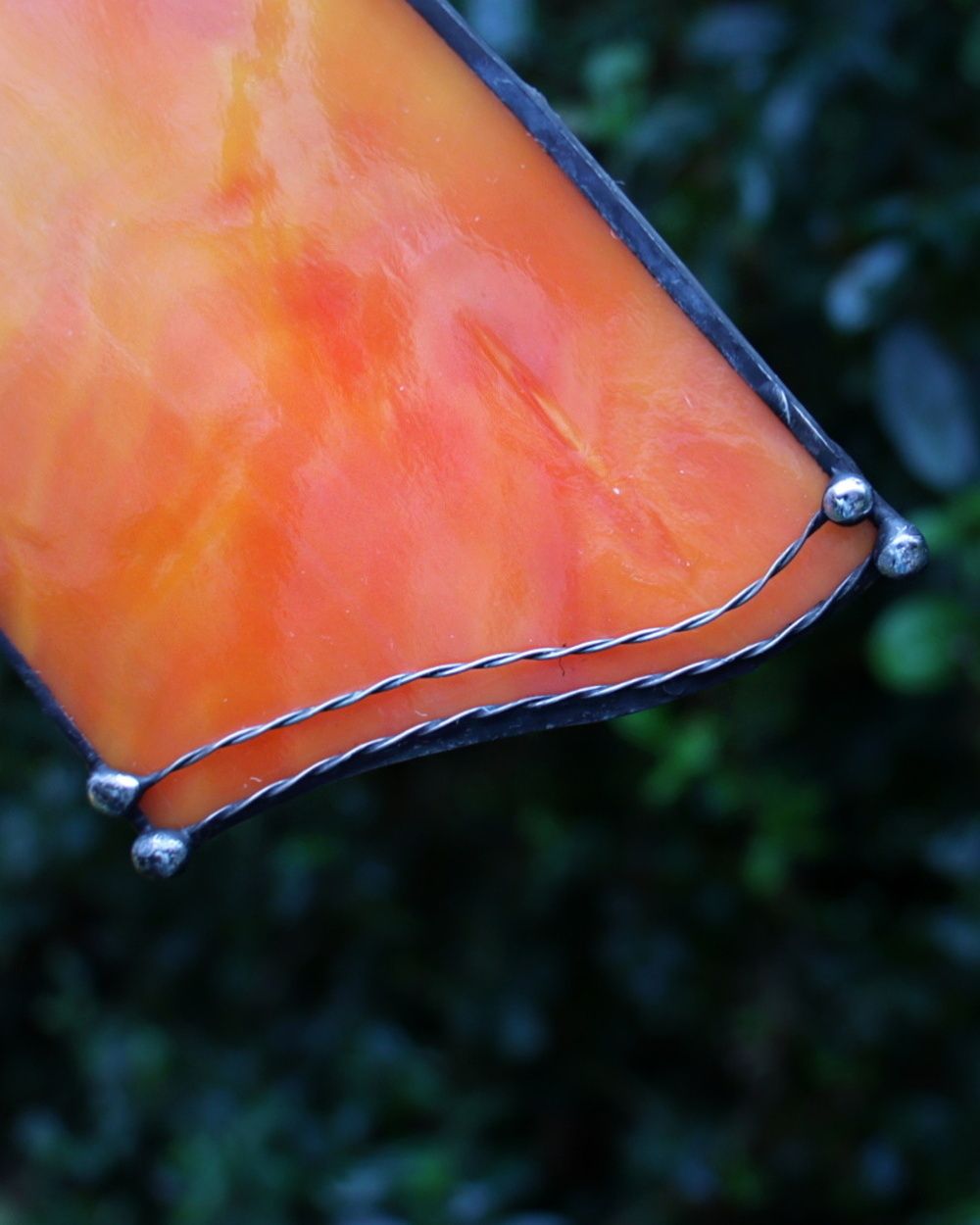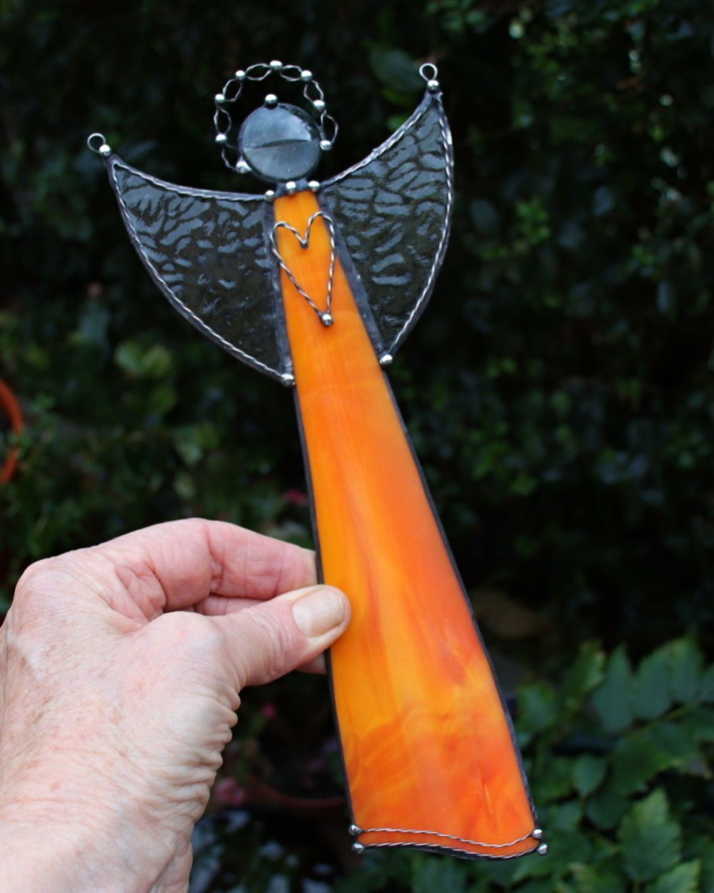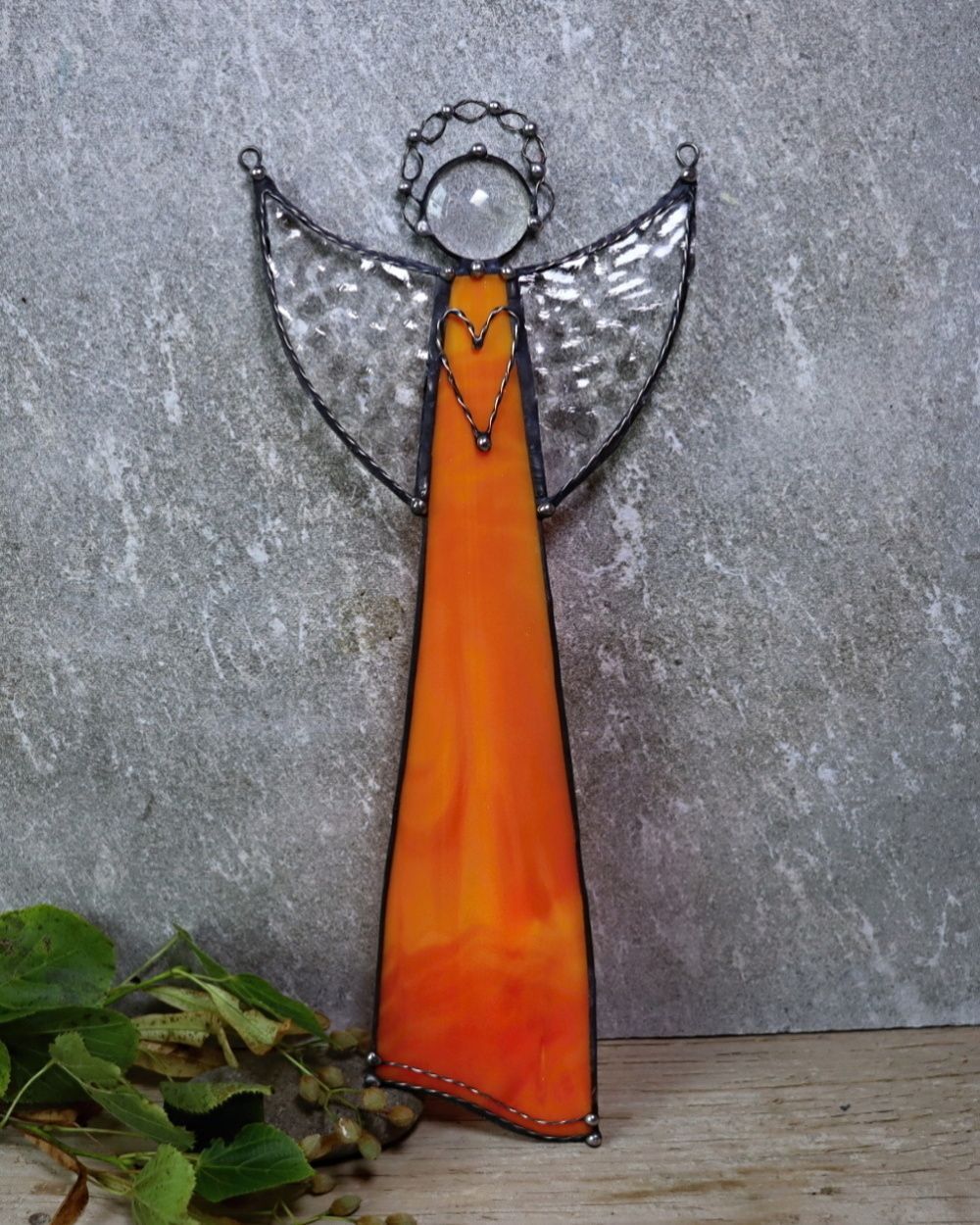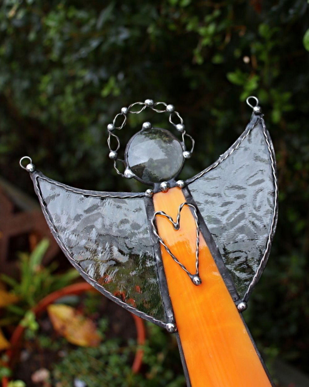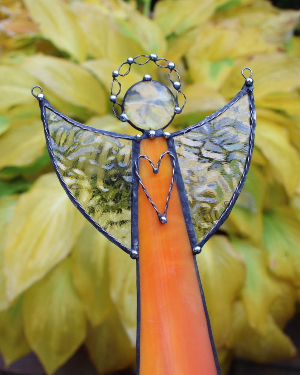 Autorská vitráž zhotovená technikou Tiffany z krásného opálového skla. Doladěno pečlivě vypracovanými detaily. Zavěšení na zeď nebo do okna za očka na křídlech. Velikost vitráže i se svatozáří je 24 cm.