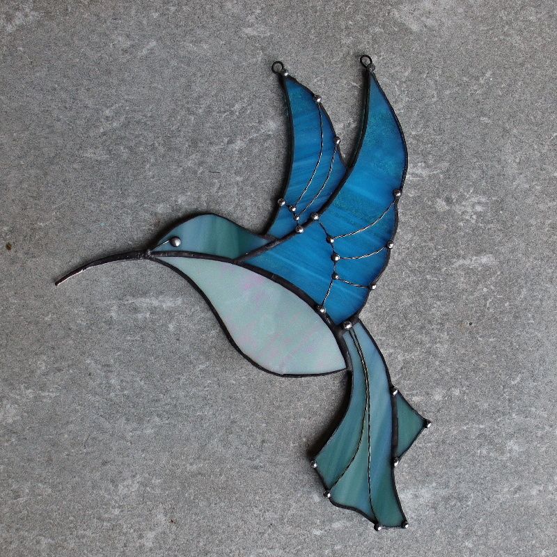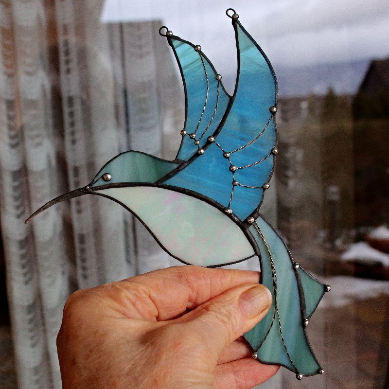 Vitráž kolibříka z krásných duhových a opálových skel, s očky na zavěšení. Odlesky bříška se mění podle dopadu světla. Dodáno bude v kartonové krabici s logem. Velikost vitráže je přibližně 18x11 cm, měřeno bez zobáčku.