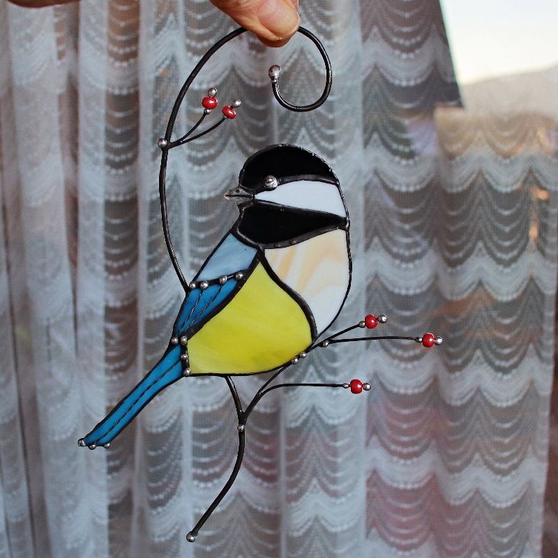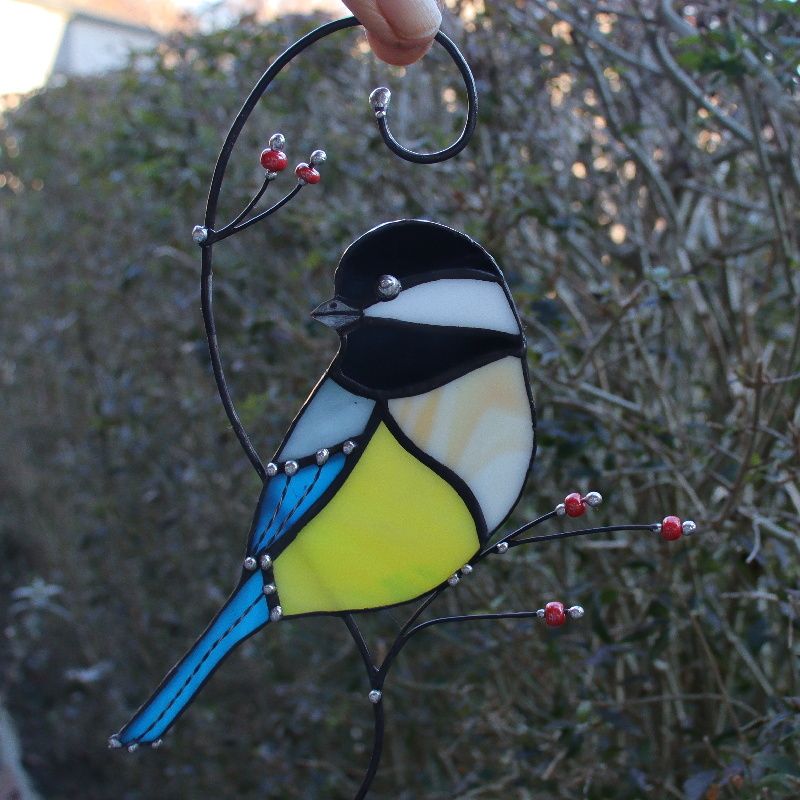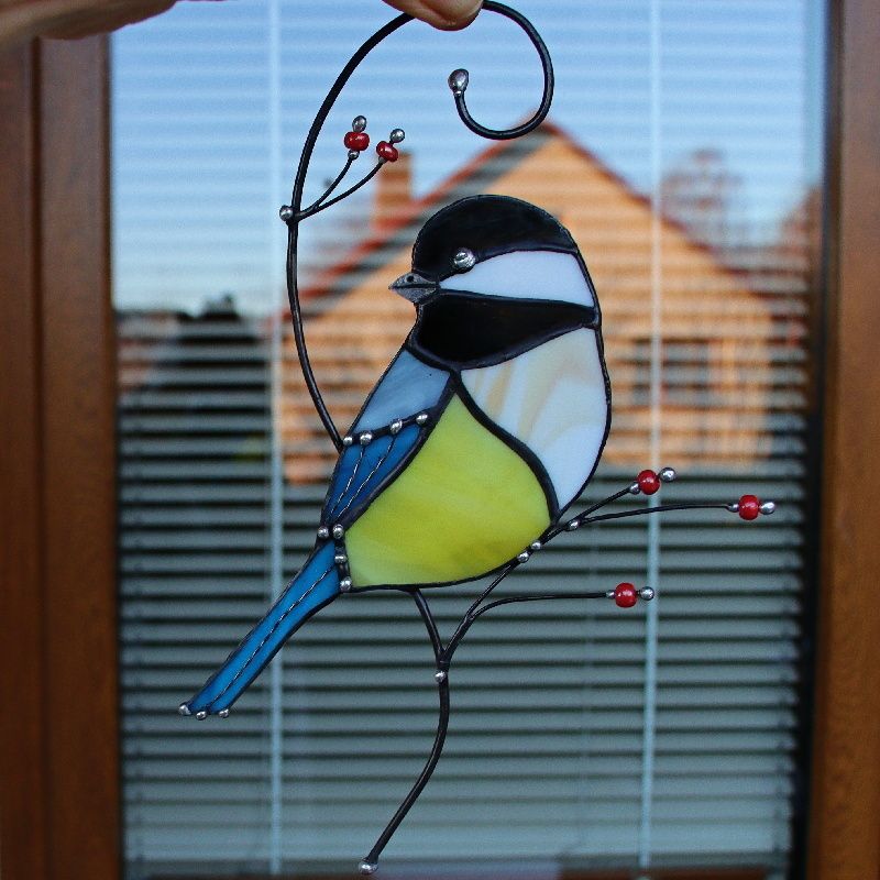 Vitráž sýkorky z opálových skel na zavěšení. Doplněno ručně mačkanými korálky od regionálního výrobce. Dodáno bude v kartonové krabici s logem. Velikost sýkorky od zobáčku po konec ocásku je 14 cm, výška celé vitráže i s drátky je 20 cm.
