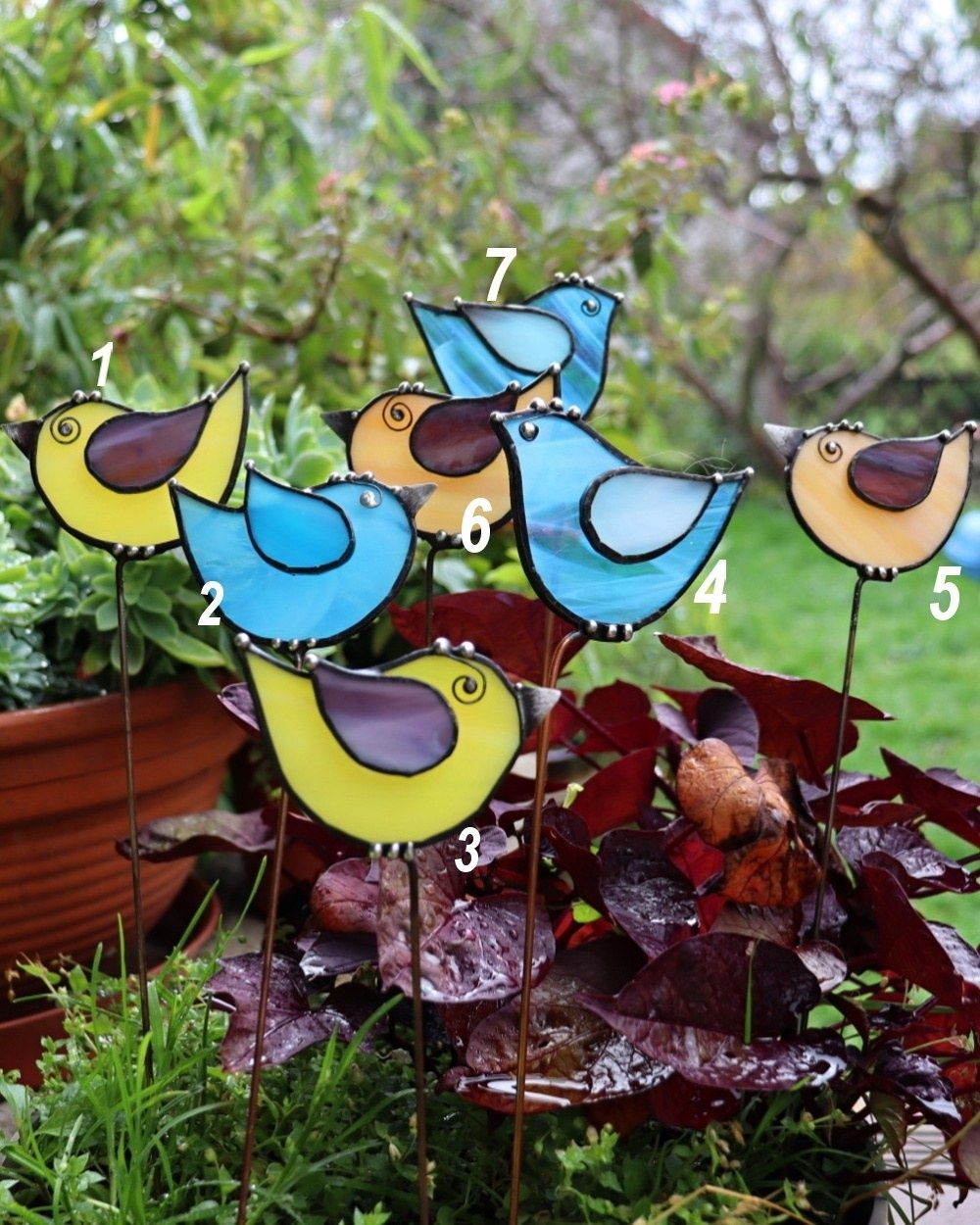 Vitráž ptáčka, použito opálové sklo, délka zápichu i s ptáčkem je 30 cm. Určeno pro vnitřní prostory jako zápich do květináče, může být i dozdobítko květin do vázy, či dekorace do zavěšeného věnce, nebo prostě jen tak dárek. Mohu na přání vyrobit i v jiných barvách. Vybírejte prosím podle čísel na fotu.