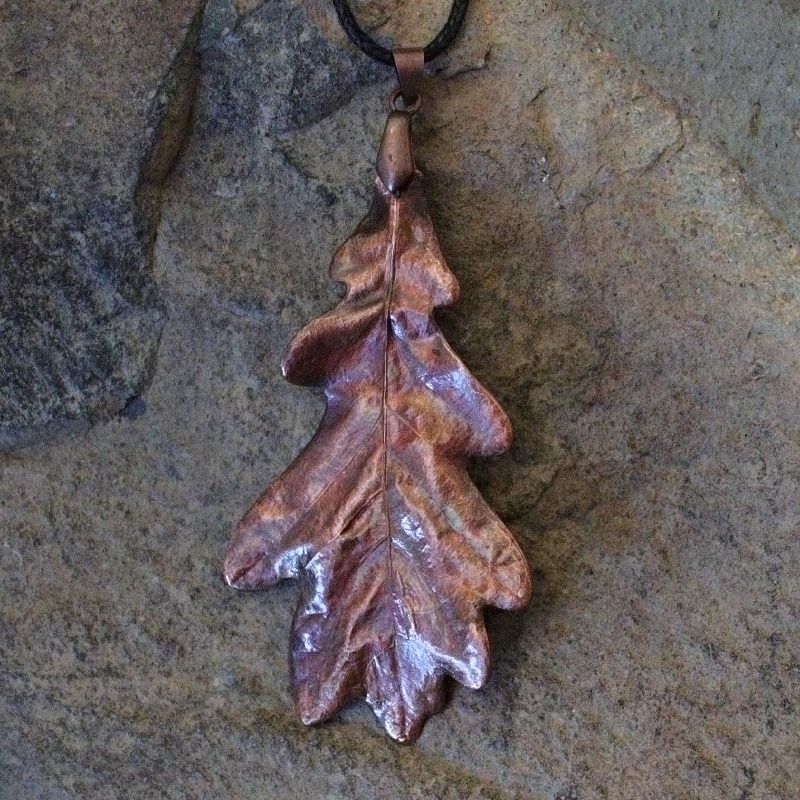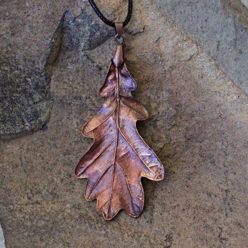Náhrdelník ze skutečného, poměděného listu dubu. Doplněno měděnými komponenty, zavěšeno na kulatém lanku.
