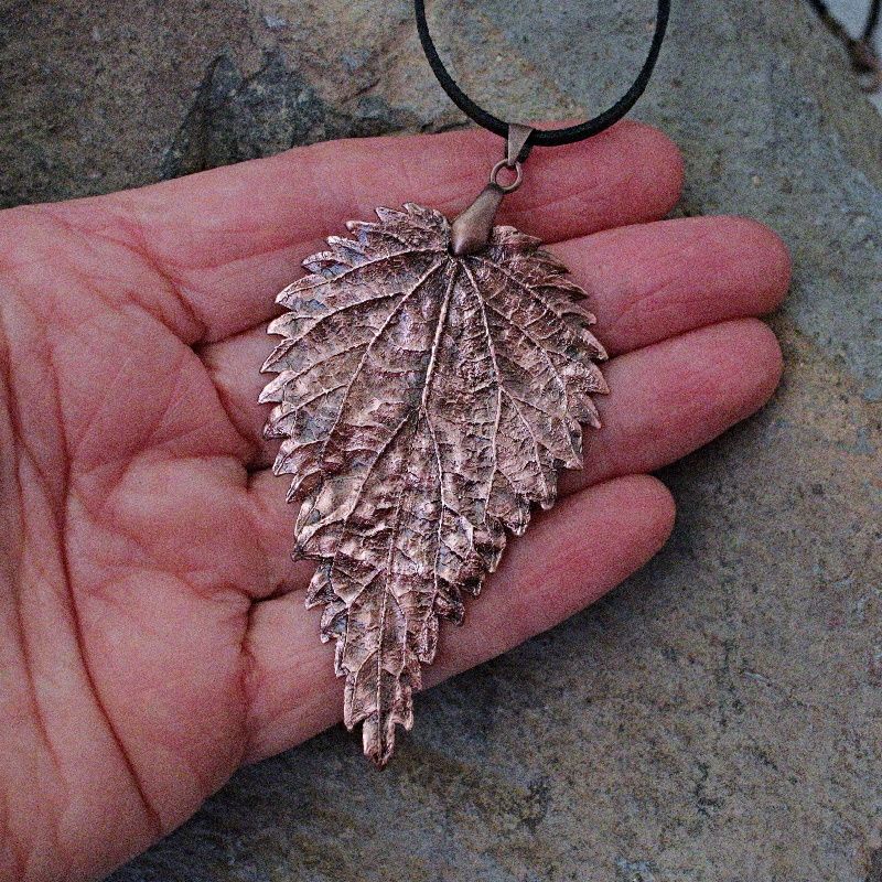 Náhrdelník ze skutečného, poměděného listu kopřivy. Doplněno měděnými komponenty, zavěšeno na ploché kůži.