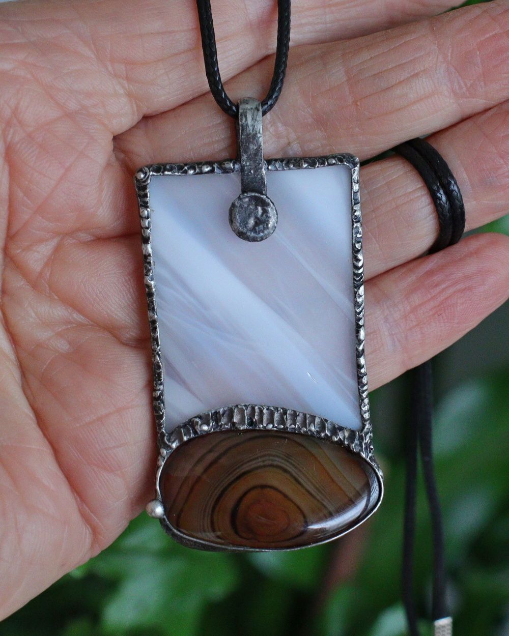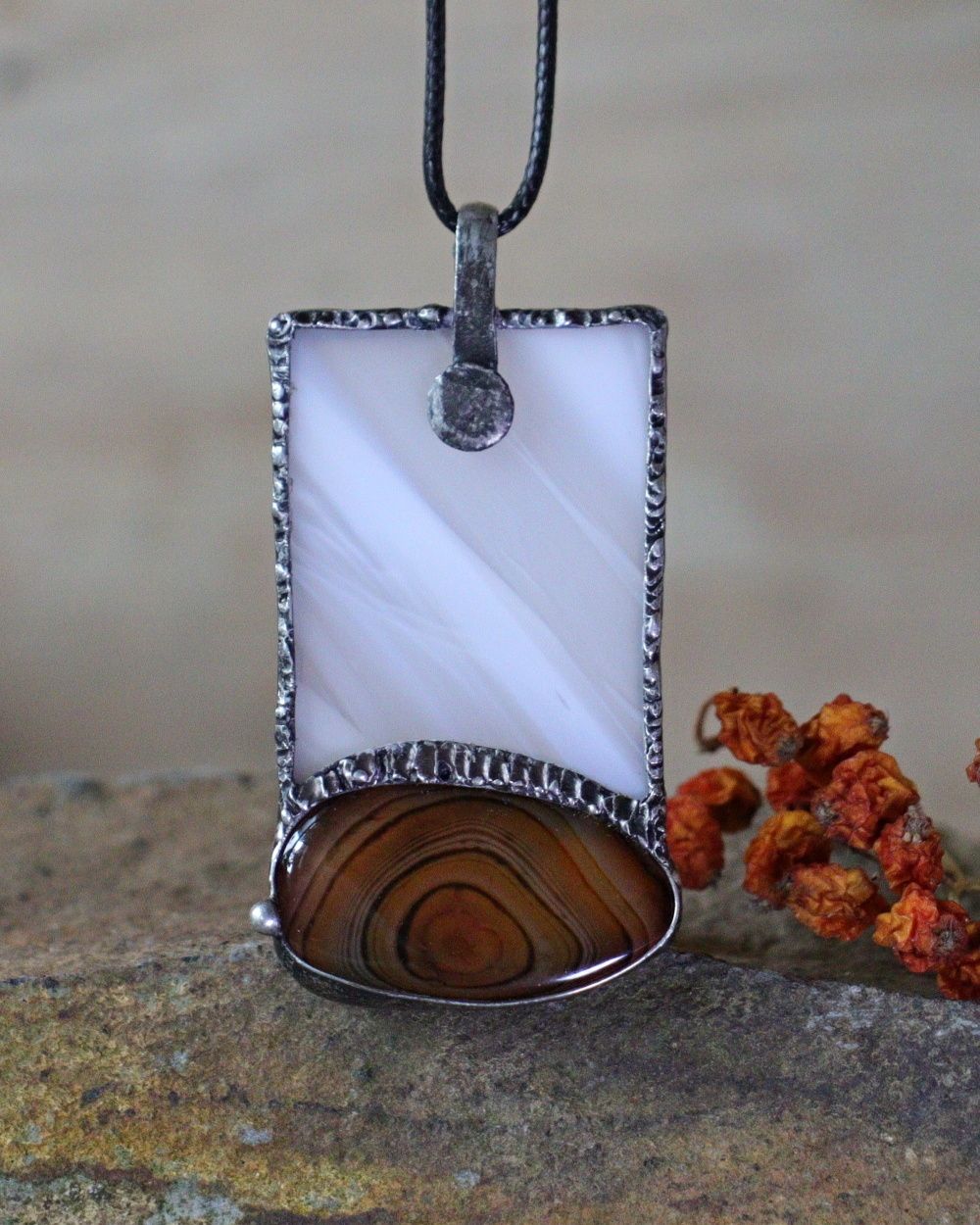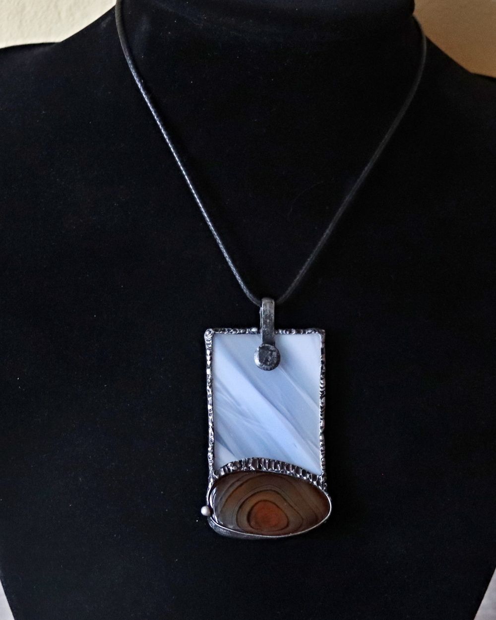 Šperk je vyroben Tiffany technikou z bezolovnatého cínu, marockého achátu a opálového skla. Sklo je pečlivě vybráno a zabroušeno tak, aby s kamenem tvořilo harmonický celek. Šperk je patinován, leštěn a ošetřen proti oxidaci. Zavěšení na bižuterním černém lanku délky 43 cm+5 cm prodlužovací řetízek, nebo na nerezové obruči. Zasílám v dárkové krabičce.