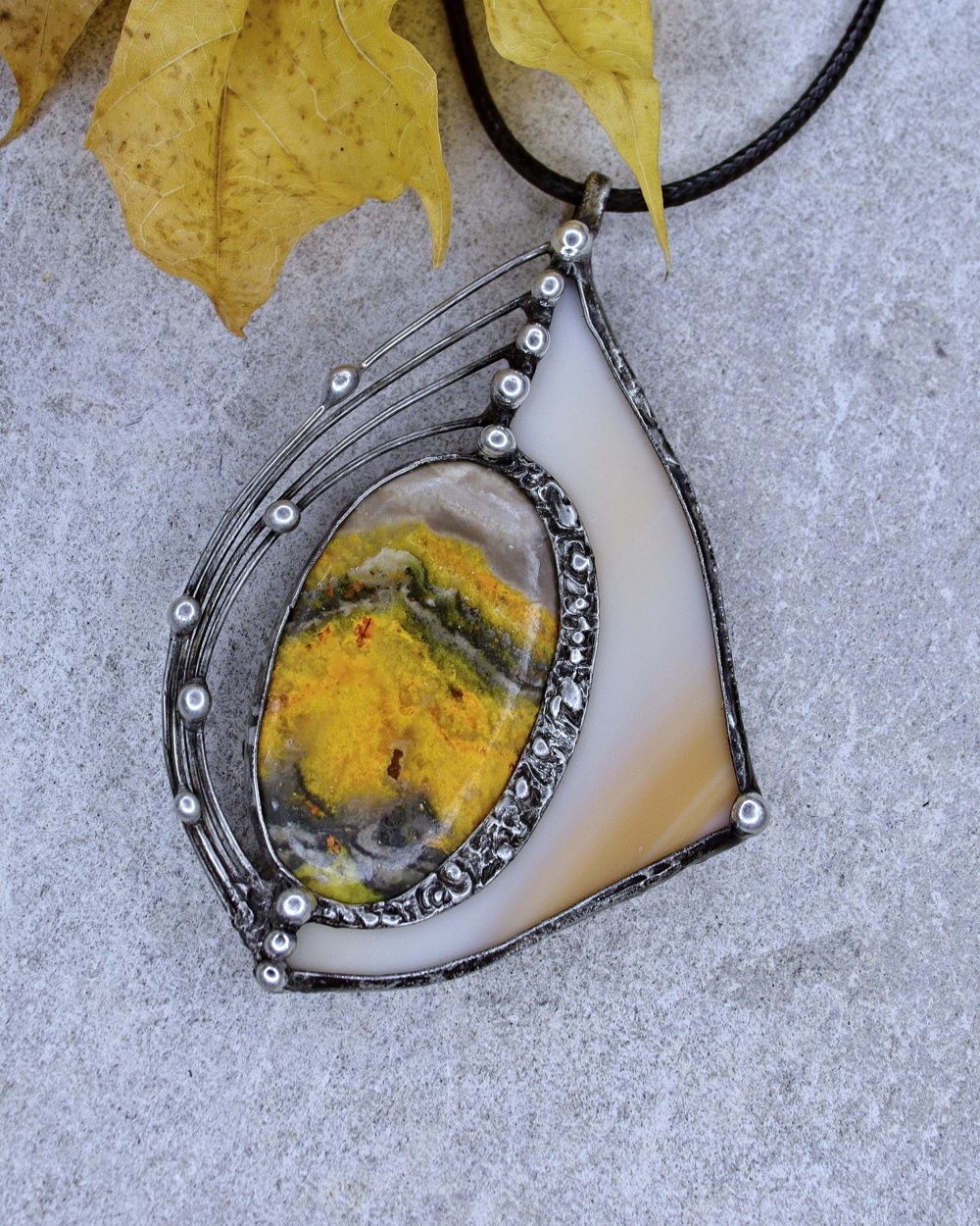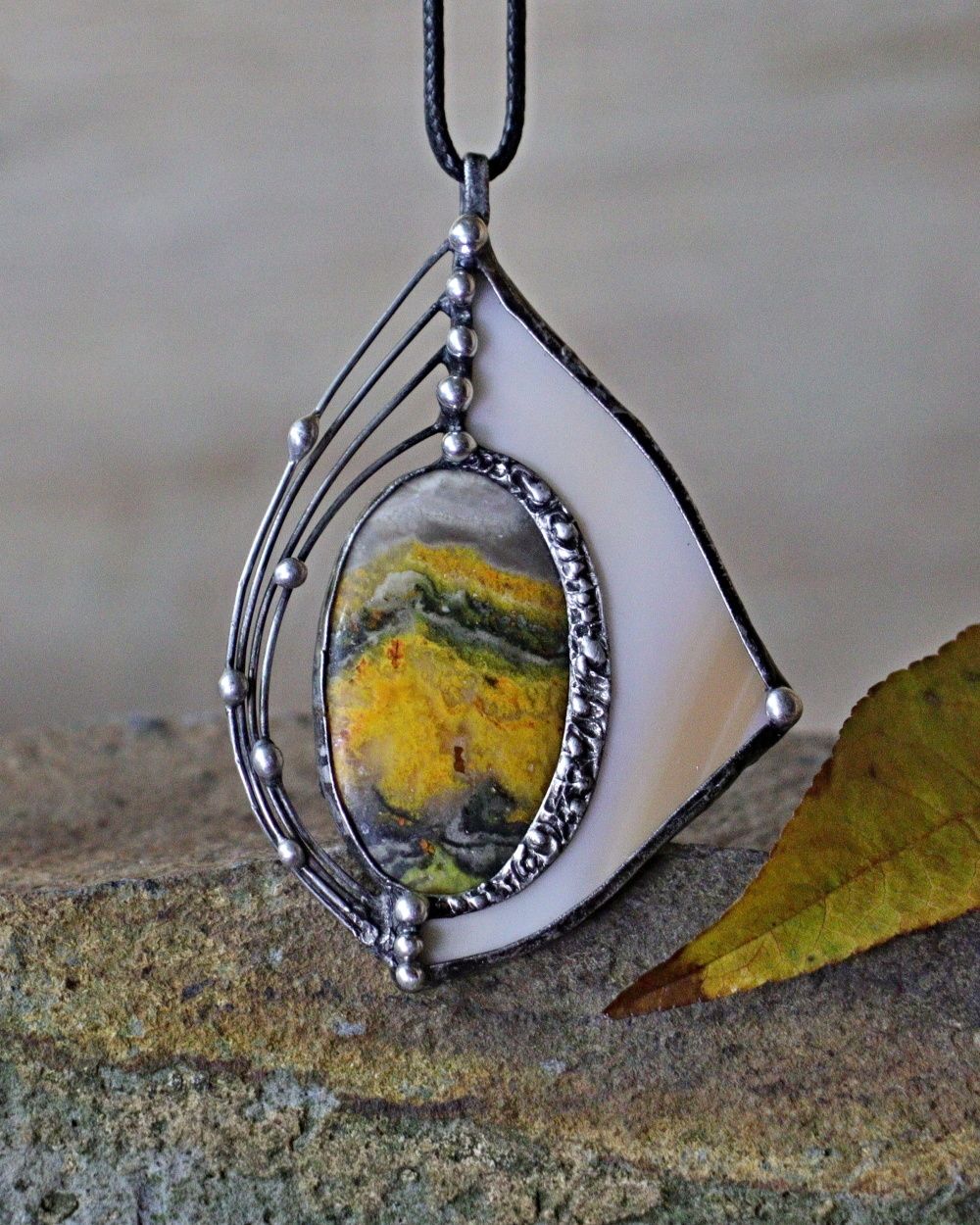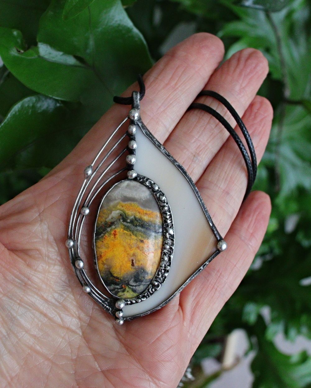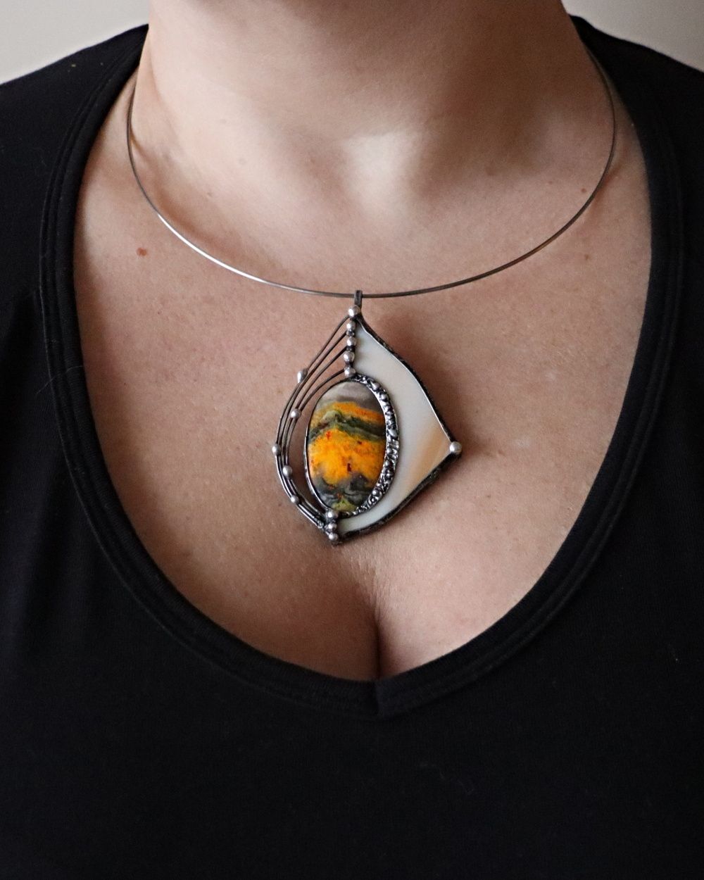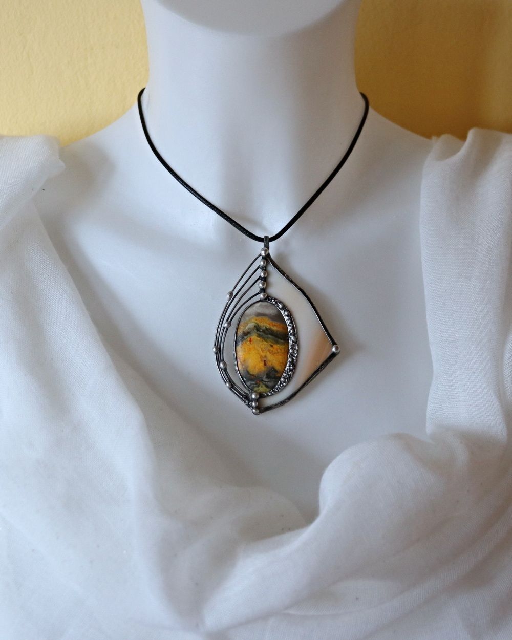 Šperk je vyroben Tiffany technikou z bezolovnatého cínu, čmeláčího jaspisu a opálového skla. Sklo je pečlivě vybráno a zabroušeno tak, aby s kamenem tvořilo harmonický celek. Šperk je patinován, leštěn a ošetřen proti oxidaci. Zavěšení na bižuterním černém lanku délky 43 cm+5 cm prodlužovací řetízek, nebo na nerezové obruči. Zasílám v dárkové krabičce.