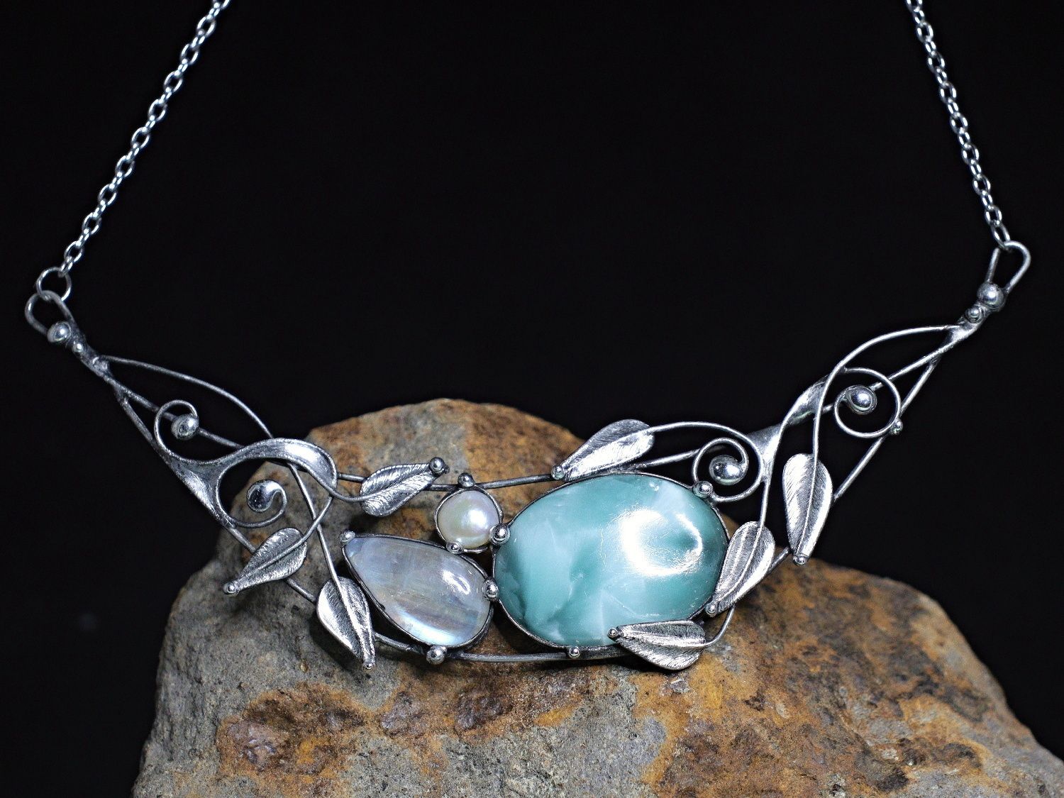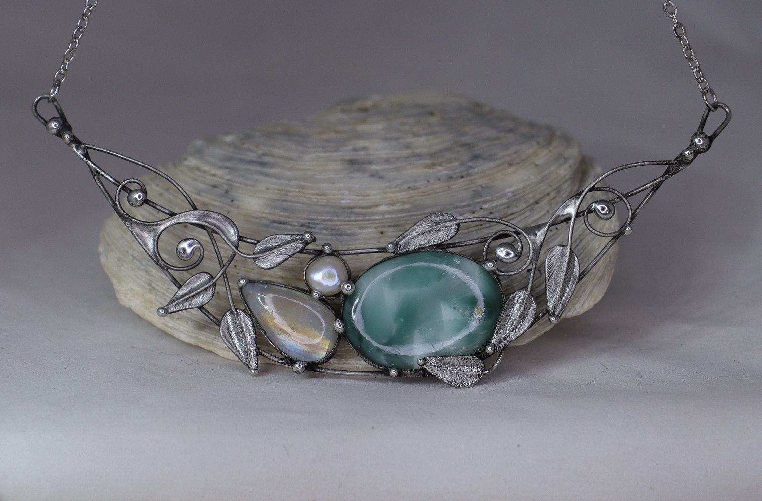Náhrdelník z hemimorfitu s krásnými, perleťovými odlesky, výběrovým měsíčním kamenem a říční perlou. Každý lísteček je vylepšen jemným rytím. Šperk je zavěšen na nerez řetízku se zapínáním na karabinku. Všechny nerez kroužky, které jsou použity na zavěšení, jsou pečlivě spojeny cínováním, aby se předešlo přetrhnutí. Hodí se i ke společenským šatům. Doporučuji i mladším ženám, neboť působí křehce a mladistvě. Šperk bude zaslán v dárkové krabičce.
