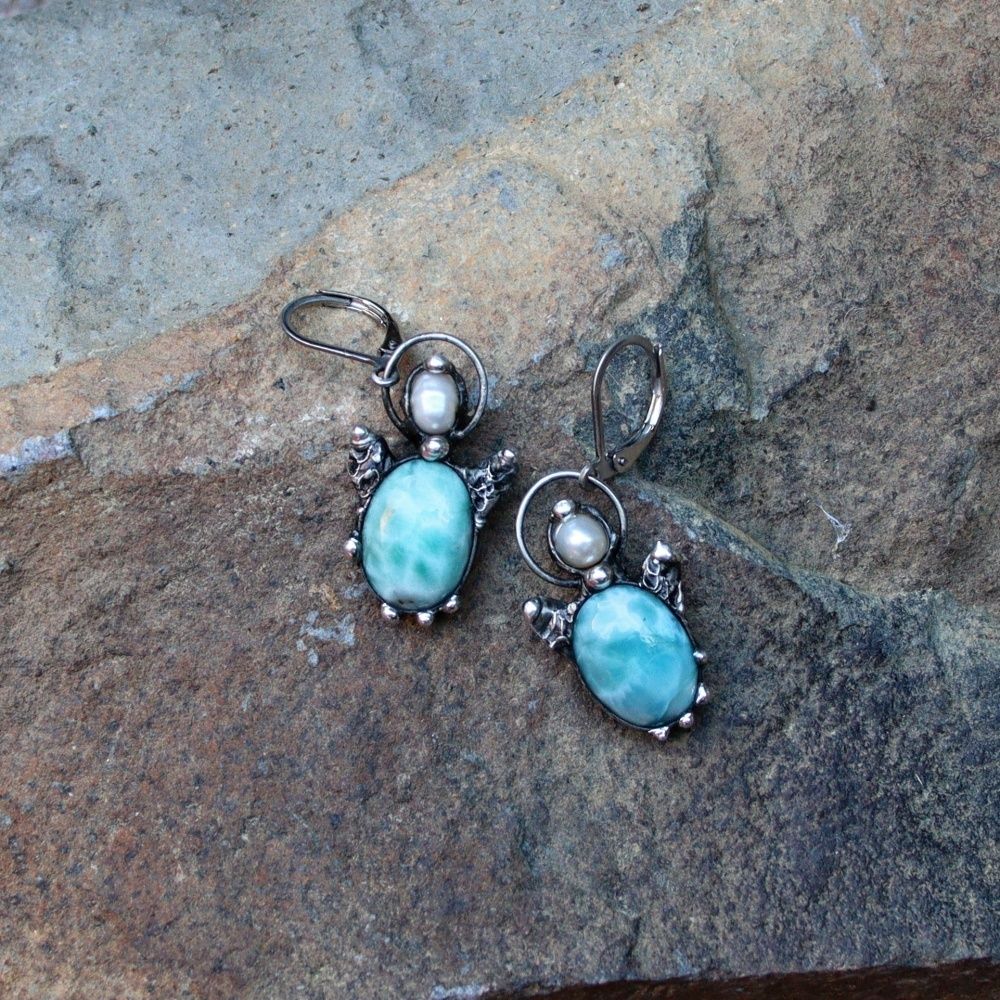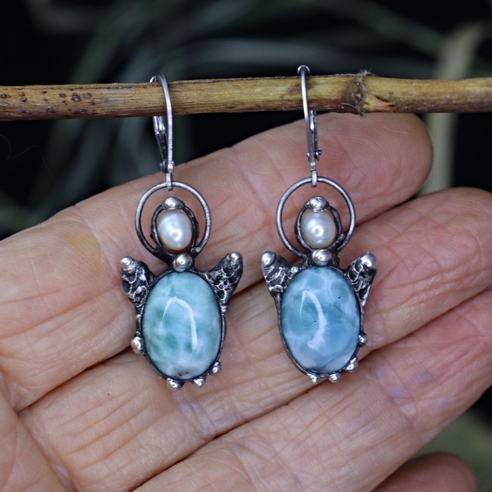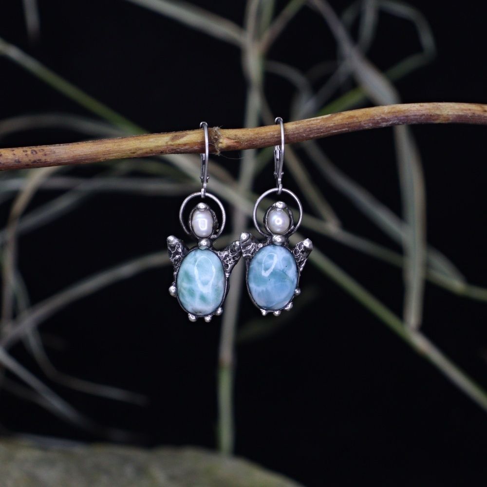Drobné náušničky z krásných a vzácných larimarů, zavěšeny na zavíracích háčcích z nerezové oceli. Velikost je 2,5cm, vyrobeny jsou ručně bez použití výlisků. Zaslány budou v dárkové krabičce.