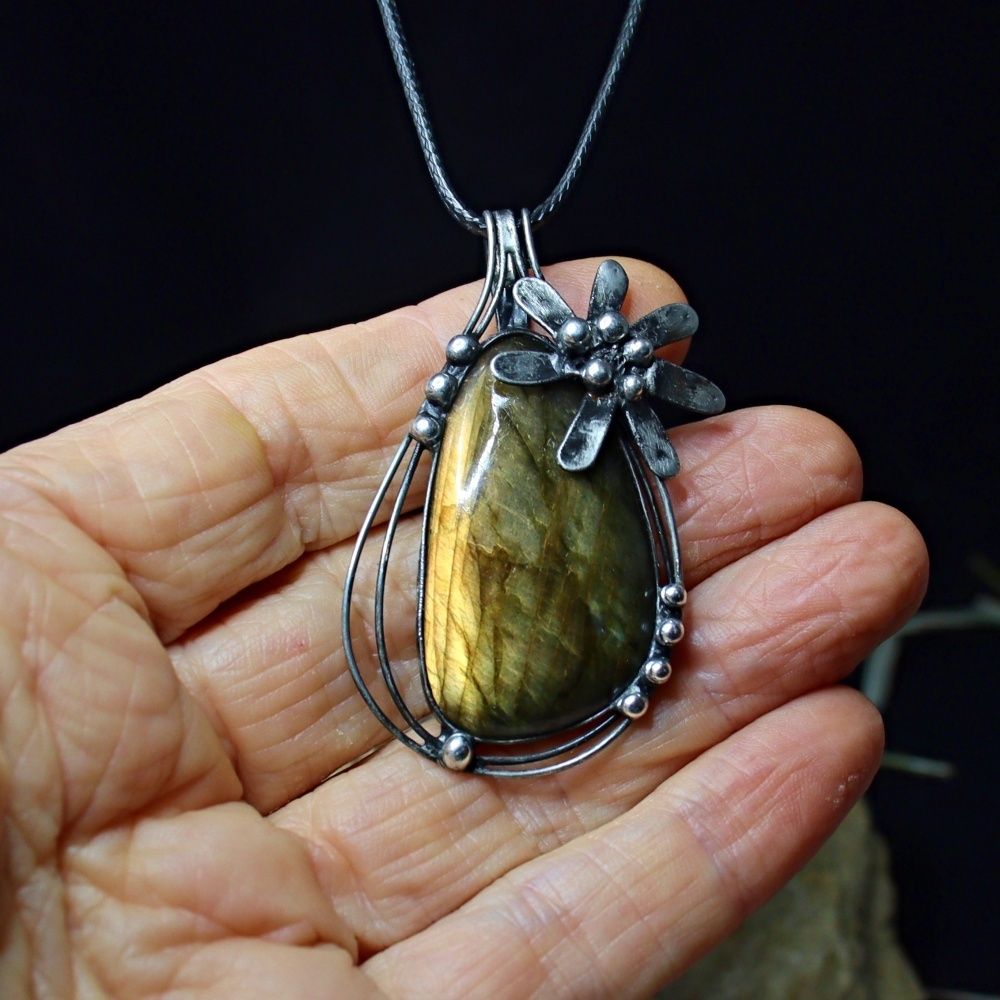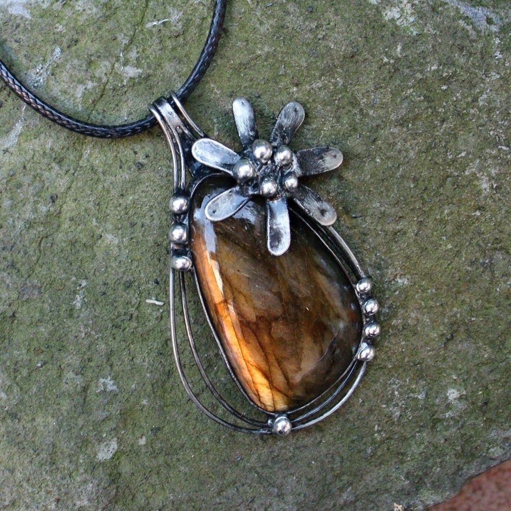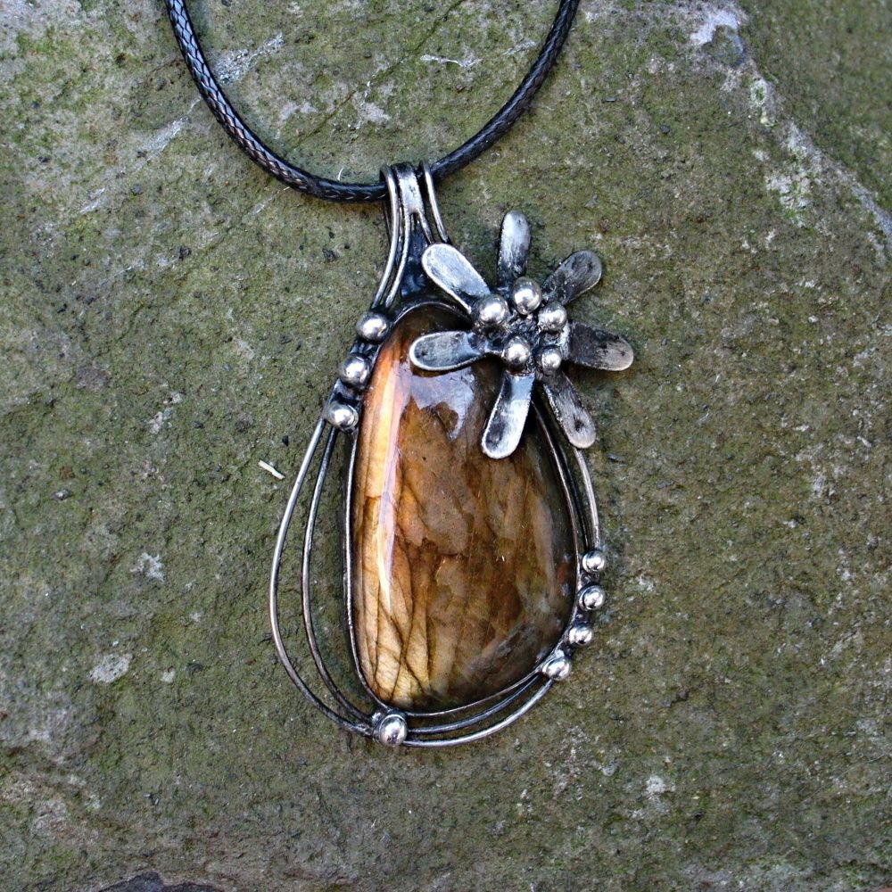 Náhrdelník je vyroben z labradoritu se zlatými odlesky, Tiffany technikou, z bezolovnatého cínu. Šperk je patinován, leštěn a ošetřen proti oxidaci. Zavěšení dle vašeho výběru. Nabízím bižuterní černé kulaté lanko délky 43 cm+5cm prodlužovací řetízek, to se používá nejčastěji, nebo nerezovou obruč, nerezový řetízek nebo plochou kůži, délka dle Vašeho přání. Šperk bude zaslán v dárkové krabičce.